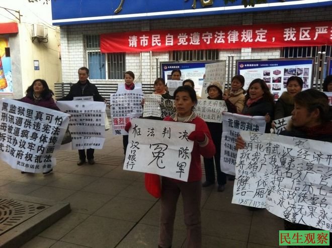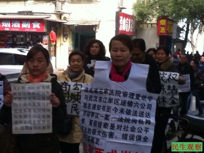 民生观察工作室2014-1-16消息:今天是2014年湖北省两会开始的第一天,武汉三镇的访民们一大早就来到会议所在地的洪山礼堂附近的一条步行街,在这里汇合后访民们拿出各自的标语、状衣向洪山礼堂进发,一路上遭到各街道截访人员、国保拦截,但最终还是有上百访民成功到达洪山礼堂前。