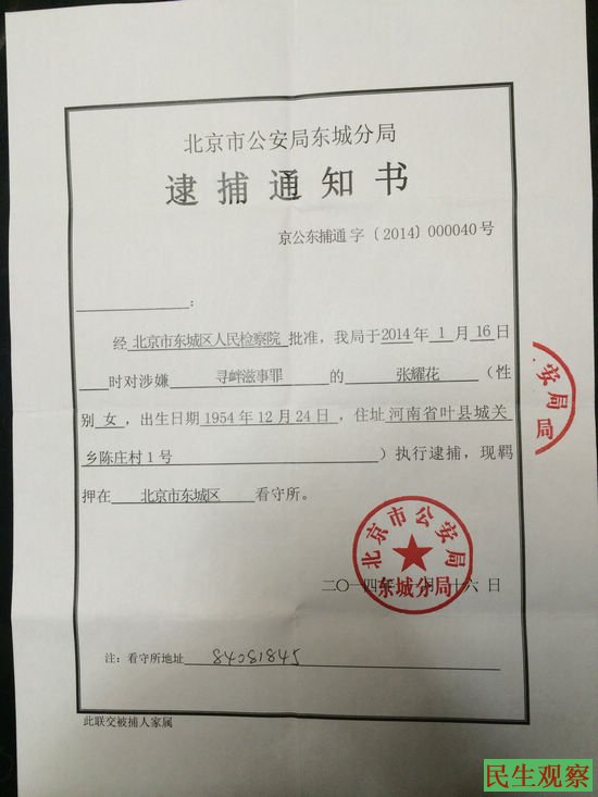据悉,为了给自己的弟弟申冤,张耀华跑遍北京各机构,但现行司法体制的腐败让她伸冤无门,被逼无奈与2013年12月12日乘52路公交车到天安门时撒传单被天安门派出所抓走刑拘。今天他的儿子向办案民警电话询问情况时,办案民警让他到天安门派出所签字,他的母亲已与昨日被北京市东城区检察院批准逮捕。逮捕书上写的罪名是“寻衅滋事”,现被关在北京昌平区七里渠乡豆各庄村645号的东城看守所。