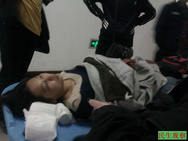 后来访民们被强拉上停在八宝山公墓门口的大客车拉到久敬庄,推搡中警察(警号040548)用对讲机砸、还有用高音大喇叭砸她们,截至昨晚,王心灵还躺在北京南院医院急诊室,身体非常虚弱,以上经过就是王心灵在半迷糊的状态下,我们耳朵贴近才能听到她低弱的声音。