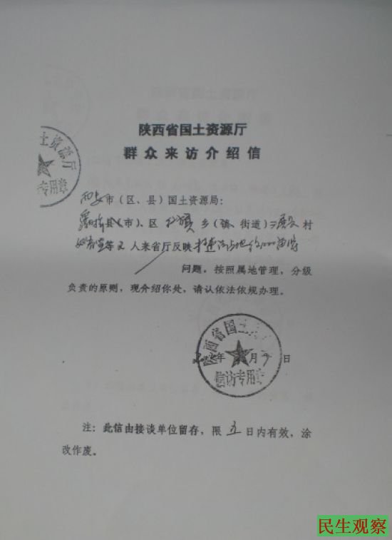 民生观察工作室2014-5-6消息:陕西省西安市灞桥区红旗街办三殿村几位村民,今天下午从到位于北京市西城区前英子胡同的国土资源部的小巷子里一脸沮丧的走出来,这几位村民操着浓重的西安口音边走边议论。上前询问得知原来这几位村民反映的是区政府和村委会非法强征村民土地,倒卖土地和宅基地等问题。他们已经向有关部门反映了4年,一点结果都没有。
