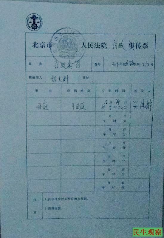 民生观察工作室2014-5-14消息:河南洛阳访民胡大料诉北京市公安局东城分局违法行使职权, 2013年12月24日对她做出错误的行政处罚一案,今天上午在位于北京市东城区交