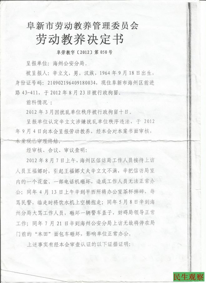 辽宁精神病患者辛立文因妻子上访被劳教的经过 |