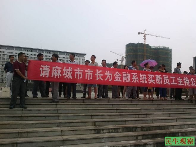 今天银行职工在市政府门口拉起横幅,横幅写着请麻城市市长为金融系统买断员工主持公道,市政府办公室主任与相关领导还有市政府一位信访局副局长接待了抗议维权人员,市政府也通知四大银行的领导到市政府商谈。