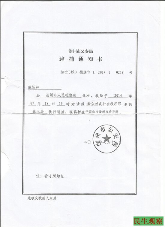 据戴紫娟说,这次张玉层又是因为2010年的事被逮捕的,这是为这个事第二次被逮捕了。