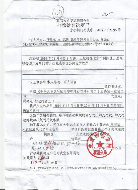 据悉,王敬枝是和同乡访民王桂峰、杨爱菊、毛树梅宪法日(12月4号)那天到联合国开发署上访被北京市公安局朝阳分局以扰乱公共秩序罪拘留,朝阳分局还让她们在处罚决定书上签下了服从不申诉的字样。
