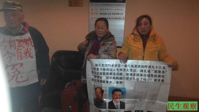 民生观察工作室2014年12月26日消息:今天上午,湖北张春霞、邹桂兰、丁振云、王先云、杨全姣、刘忠莲、彭汉宜、王德敏、伍王红、周良娟、何新民等十一人,在湖北省驻京办所在在湖北大廈上访。