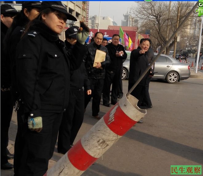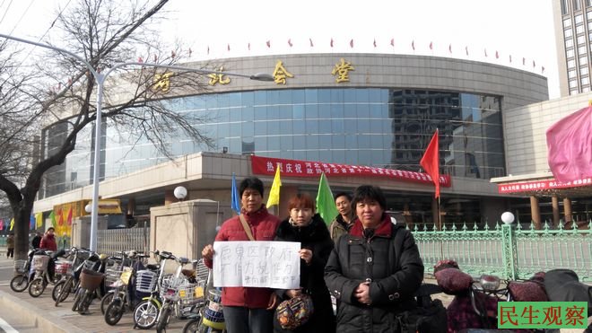 今天在会场(河北会堂)外很多访民前来递交材料被警察拦挡,访民就连人行道都不许站立,其中一警察还要动手打人,拉扯中有访民张向丽的衣服被扯坏,警察的行为遭到访民的指责,于是他们就调来了特警强行把张向丽、张翠磊、鲍润蒲、王军平四人押上车带离。