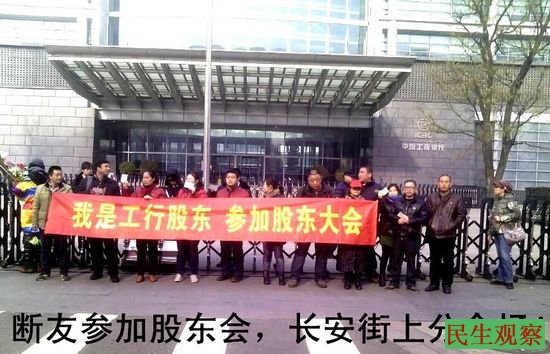 民生观察工作室2015/1/23日消息:今日,是中国工商银行召开股东大会的日子,来自全国各地45多位被买断工龄的职工代表在持有该行股票的情况下,被拒绝进入主会场参加股东大会。