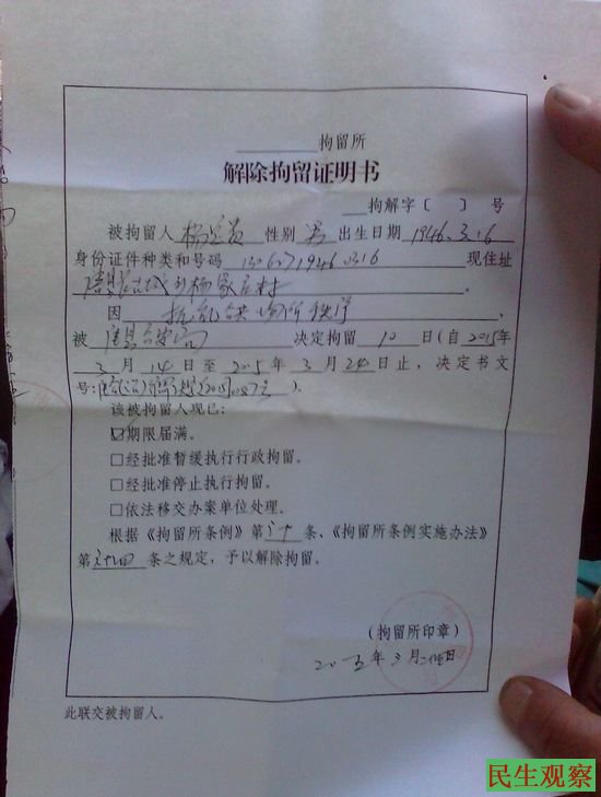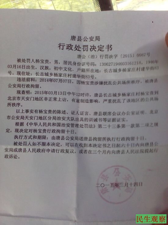民生观察工作室2015-3-24消息:河北唐县访民杨宝贵3月13日到天安门上访被送至久敬庄,14日被带回原籍,唐县公安局以扰乱公共场所执行为由将其行政拘留10天。今天上午杨宝贵获释后再次进京上访。