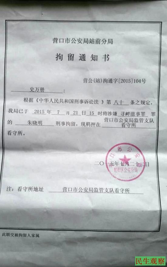 民生观察工作室2015/7/23消息:马三家受害人朱晓明,7月20日下午在家中被带走,21日下午被营口市公安局站前分局以涉嫌寻衅滋事罪刑事拘留,现关押在营口市看守所。