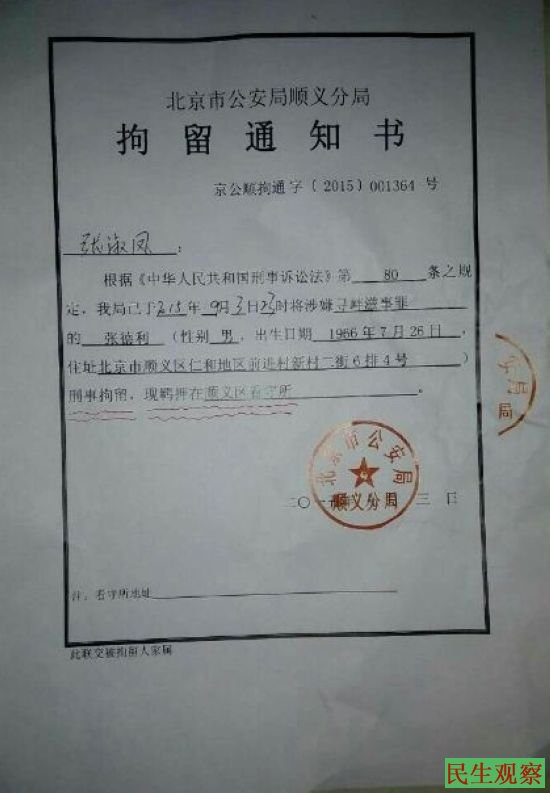 民生观察工作室2015/9/5消息:北京访民张德利因抗战胜利纪念日活动8月16日就一直被非法拘禁在宾馆里,9月3日顺义分局仁和派出所警长宁晓征给其妻张淑凤送去了家属通知书,通知书上载明张德利被以寻衅滋事罪刑事拘留,现关押在顺义区拘留所。