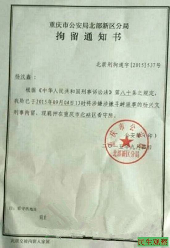 民生观察工作室2015/9/5消息:重庆访民杨兴文9月3日上午10时许在重庆抗战胜利纪功碑下被渝中区大阳沟派出所两人强行带到派出所,9月4日被重庆市公安局北部新区分局以寻衅滋事罪刑拘,现关押在北碚区看守所。
