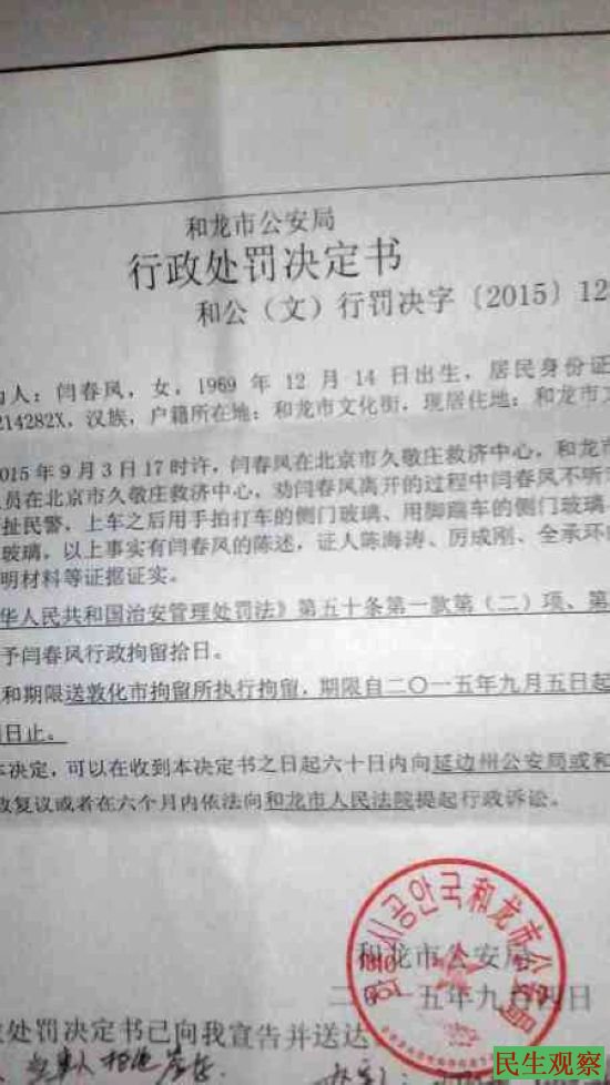 而这次拘留闫春凤的原因是在她被和龙市公安局强制接回的车上以“上车之后用手拍打车的侧门玻璃,用脚踹车的侧门玻璃”为由拘留,之前也曾因房屋被强拆上访而遭到拘留。今年又因声援被无辜枪杀的徐纯合被拘留20余天。