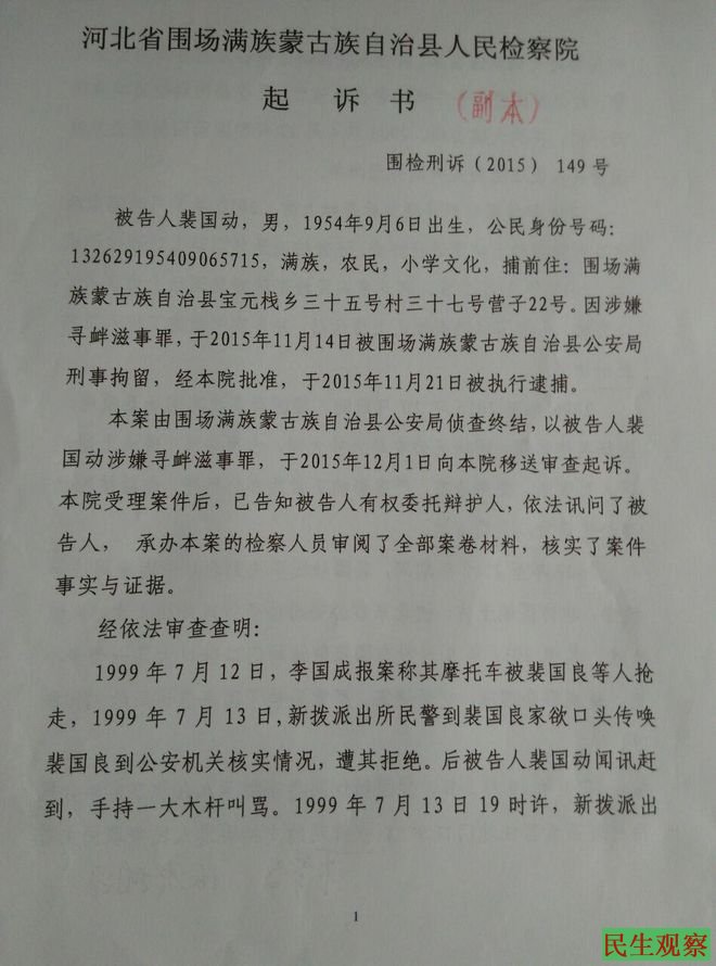 承德围场满族蒙古族自治县检察院公诉书中载明, 2015年11月14日裴国栋被蒙古族自治县公安局刑事拘留,11月21日被执行逮捕,12月1日公安局侦查完毕移送检察院审查起诉,12月9日检察院向蒙古族自治县人民法院提起公诉。
