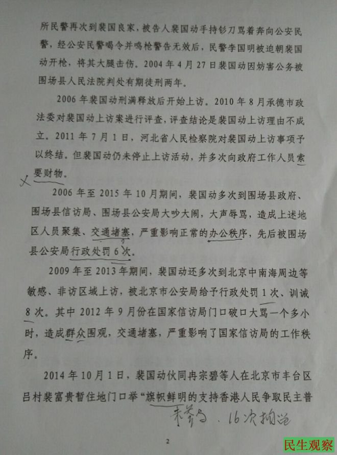 其主要“罪证”就是政府和公安截访人员的笔录。其中还有裴国栋因上访被6次行政拘留和8次训诫的书证,及裴国栋和在京访民拉的“旗帜鲜明的支持香港人民争取民主普选的斗争”“公安乱法,欺善保恶”等发到维权网上的条幅照片。