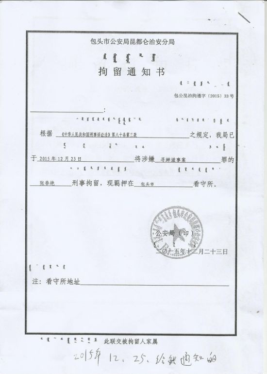 内蒙访民张春艳被以涉嫌寻衅滋事罪刑事拘留 |
