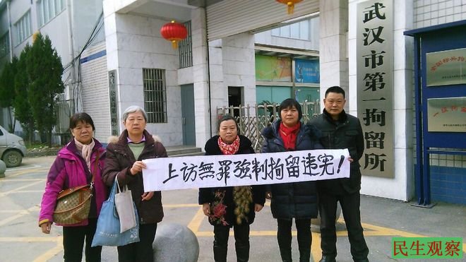 据武汉访民江玉云告诉本作室,以上这五人因到北京马家楼被认定为非正常上访,2月14、15号前后押回武汉后被控寻衅滋事、扰乱社会秩序拘留十天,关押在武汉市场第一拘留所。