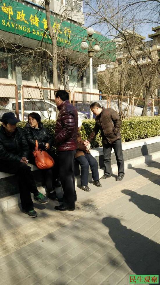 民生观察工作室2016/2/29消息:今天中午,吴继新等十数访民到北京市公安局门前看望昨日遭遇抢劫的浙江乐清市访民金丽丽时,偶遇河北涉县井店镇政府人员暴力截访。
