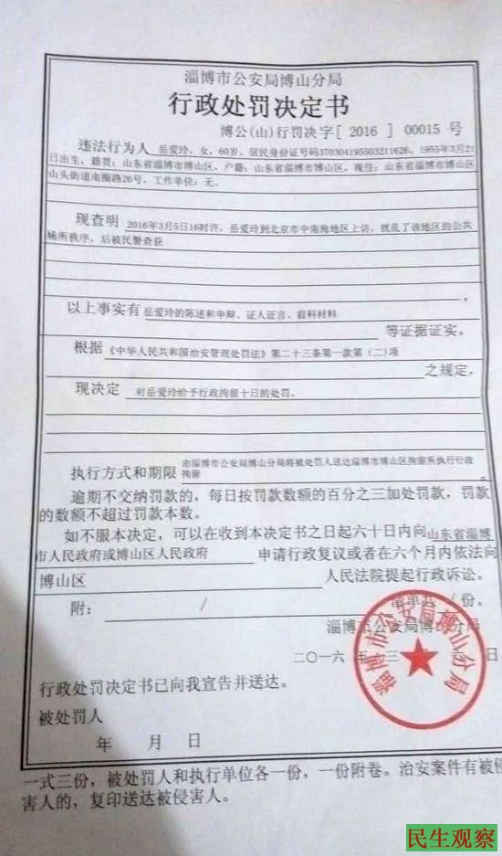 山东淄博访民岳爱玲中南海上访被拘留10天