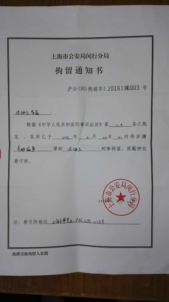 此后,沈佩兰一直未能回家也与外界失去联系。事隔近两个星期,闵行公安分局才出具了刑拘家属通知书。其家属称,沈佩兰被带走的第二天就被送到了奉贤看守所,其家属多次催要结果,警方才给了家属通知书。而沈佩兰被抓走之前一直被马桥镇政府人员看管在家。