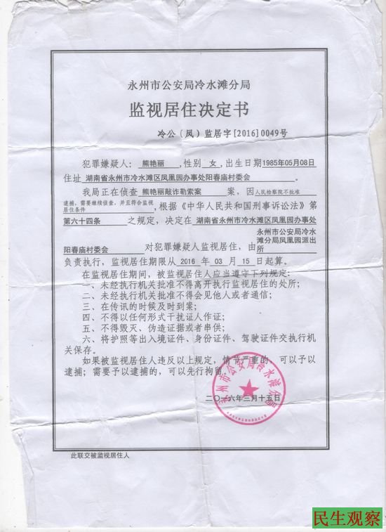 湖南永州市访民熊艳丽被以敲诈勒索为由监视居住