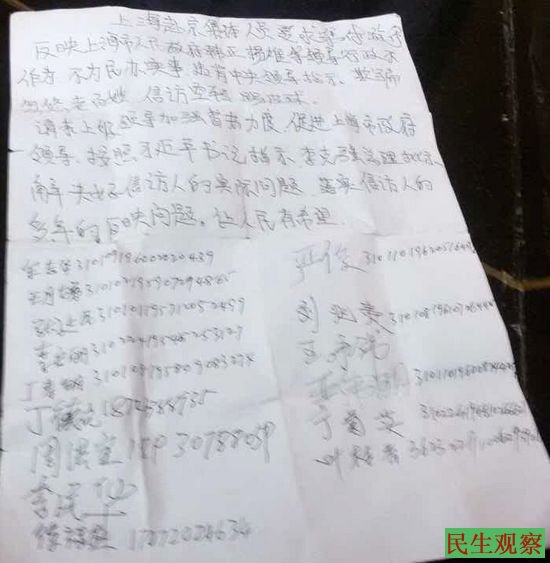 上海访民说,多年来上海当局违背中央指示精神,掠夺民财,欺骗忽悠老百姓,造成信访事项空转,踢皮球,还对信访人实施残酷的打压迫害,许多访民被拘留。申请游行示威的目的就是督促政改,做到政令通、法令通,党、政官员不在屠杀残害人民!