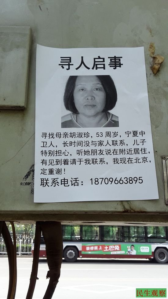 民生观察工作室2016/5/30消息:宁夏中卫市访民胡淑珍今年两会期间上访失踪,他的儿子近日到北京经过多方打听,报警,遍贴寻人启事仍没有胡淑珍的消息。