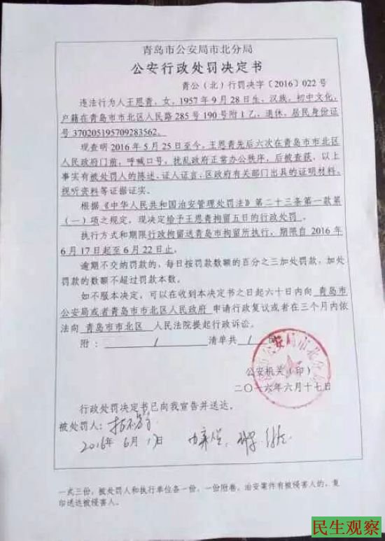 民生观察工作室2016/6/18消息:今天上午9点,山东青岛访民王恩青在青岛市市北区政府上访喊冤,随后被抓走拘留,现羁押在青岛市拘留所。