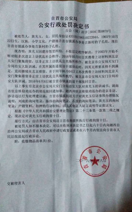 此外,湖南湘西吉首维权人士黄光玉,由于政府不作为,买了今天的车票决定进京上访,当地政府获悉后直接把她从她的租住房内强行带走,控制在吉首市石家冲派出所,晚上获悉其被拘留10天。黄光玉联系电话:18573994677