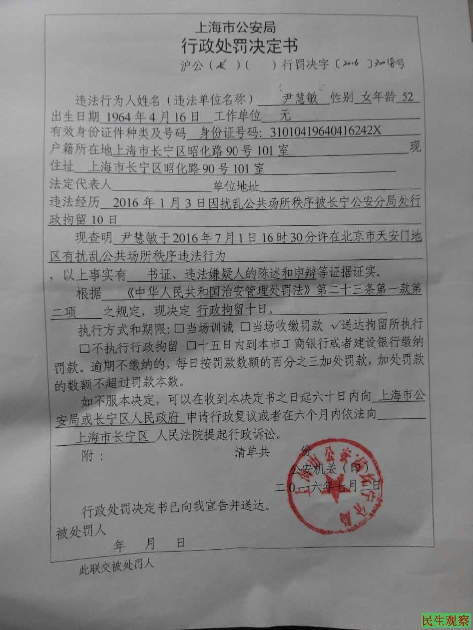 民生观察工作室2016/7/17消息:上海市长宁区访民尹慧敏,因7月1日到天安门散心游玩被北京警方查出访民身份后交地方政府带回,被长宁区公安分局以扰乱公共执行拘留10天,13日期满获释。
