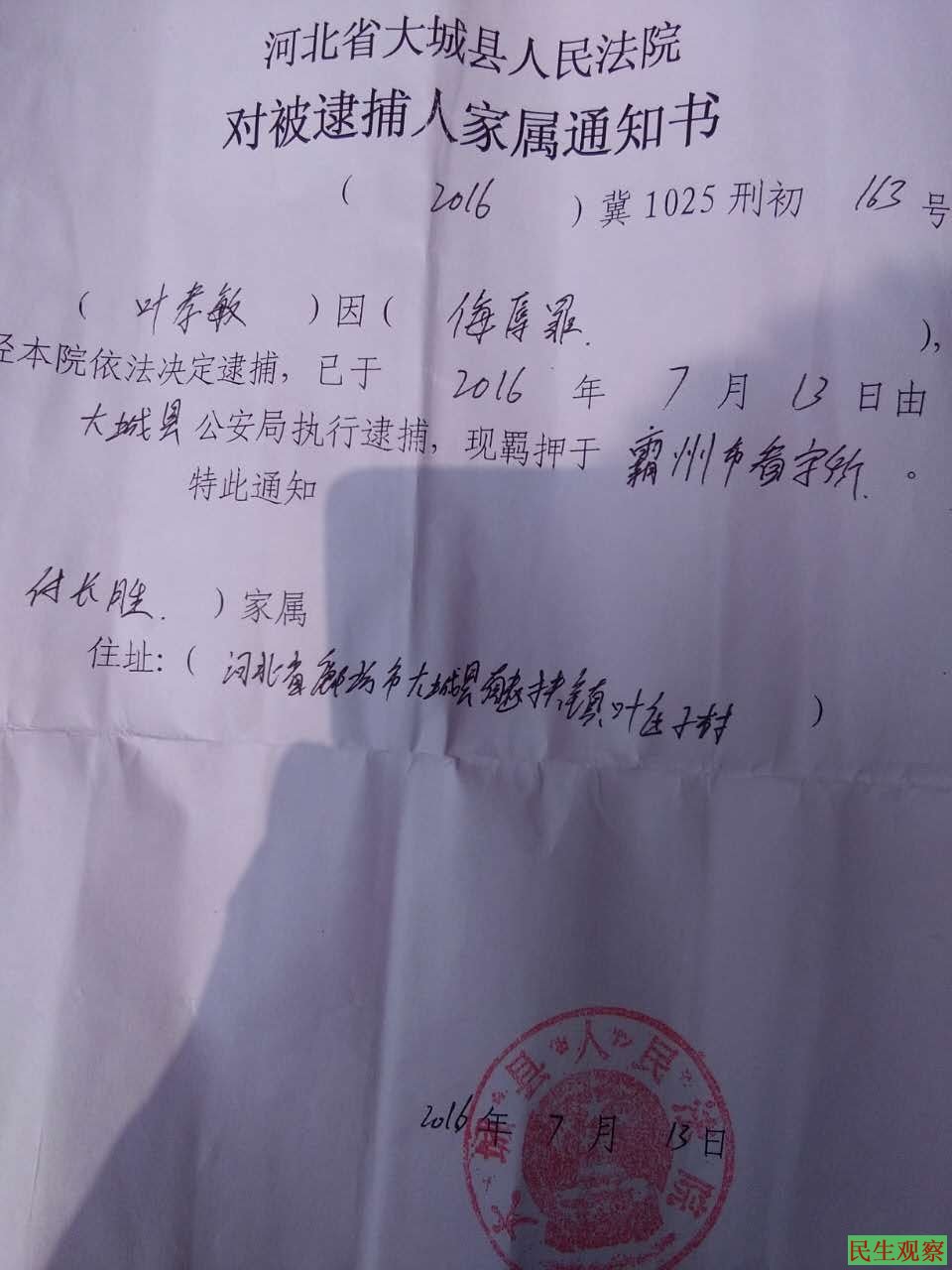 河北廊坊市访民叶孝敏被法院以侮辱罪批捕
