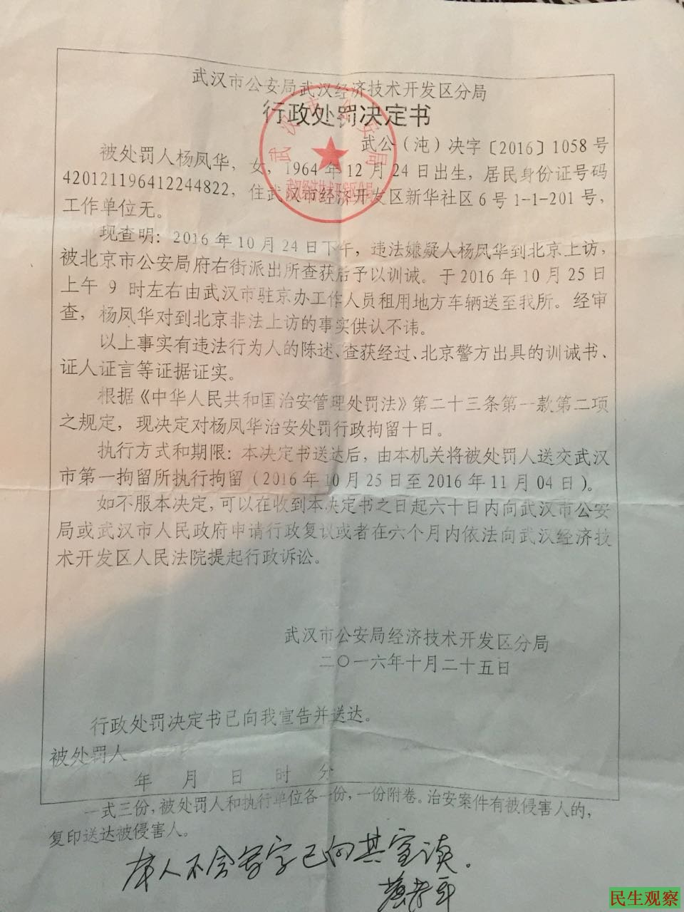 杨凤华是武汉市经济技术开发区新华社区的一位访民,10月24日中共六中全会开始的第一天,正在北京的杨凤华因到中南海邮局寄信,被北京警察抓住训诫,说是非法上访。25日被武汉驻京办租车押至武汉市场公安局武汉市经济技术开发区分局湖滨派出所后,即被行政拘留十日。