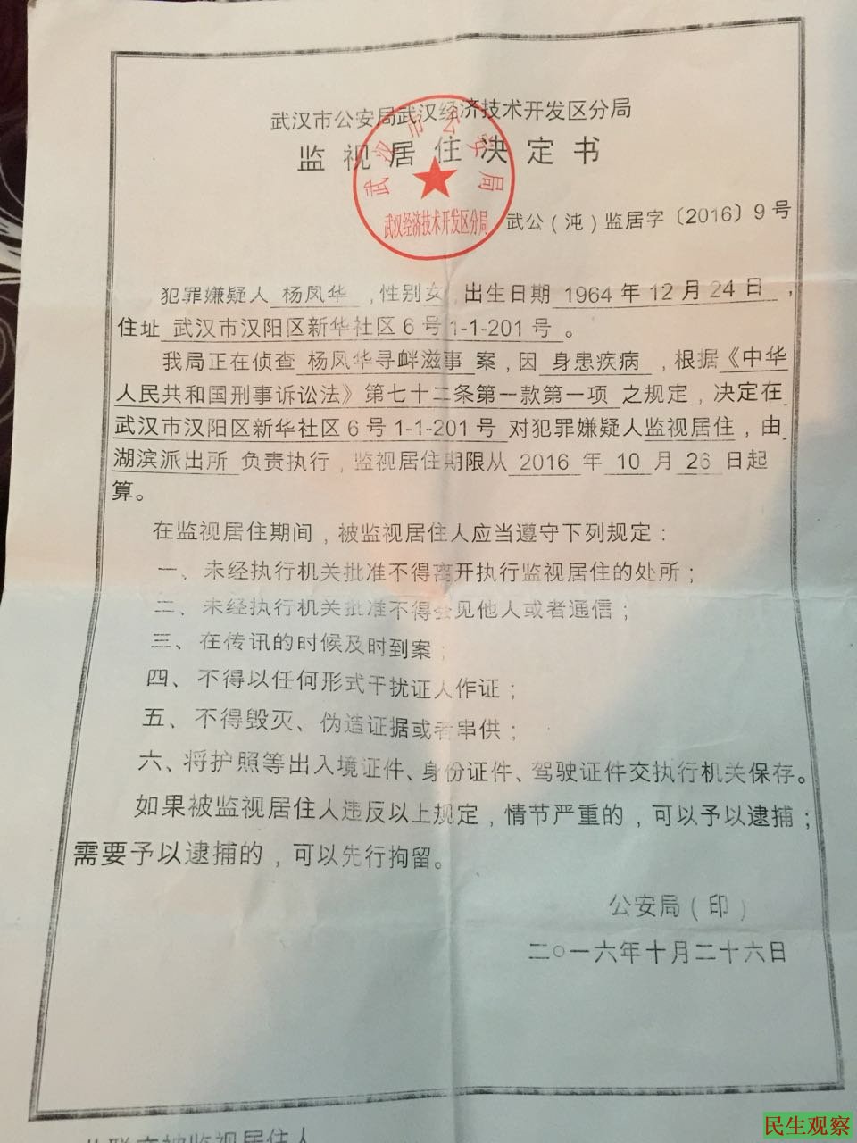 杨凤华被送到武汉市第一拘留所后,因血压太高拘留所拒收。26日杨凤华被送回家后,武汉市经济技术开发区分局即对其下达监视居住决定书,对其从10月23日起开始执行监视居住,地点在杨凤华家中。但由于身体不佳,26日晚杨凤华被送到武汉市汉南区人民医院一房间内关押,新华社区四、五名人员对其进行看守多日。