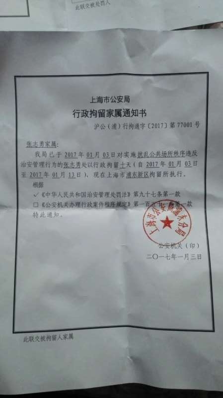 据知情人叙述,张志勇是2017年1月1日因拆迁问题再次进京诉冤,于1月3日被送回上海,浦东公安分局以扰乱公共秩序为由将其行政拘留十日。