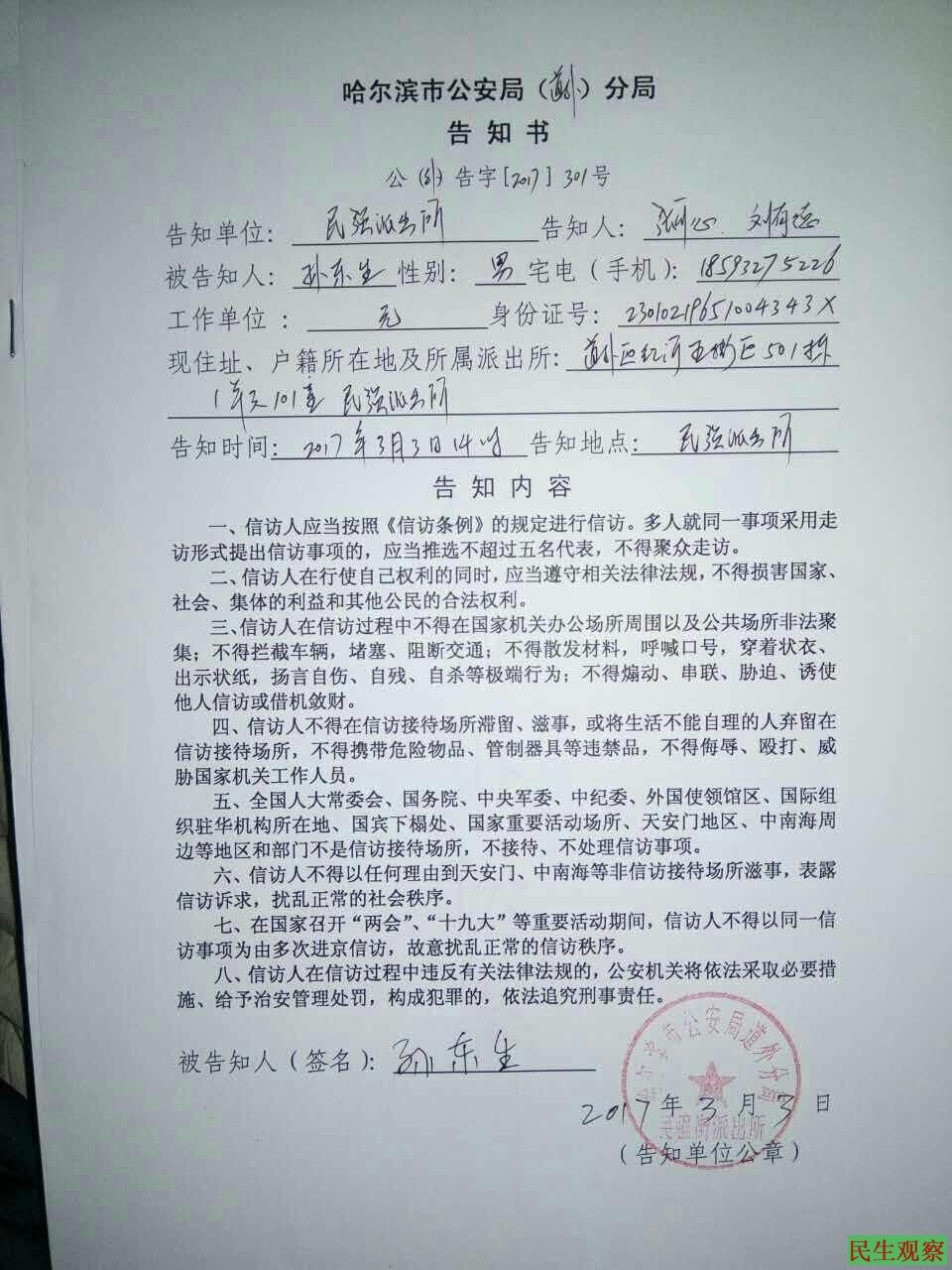 被问到回去后有没有受到处罚,孙东生说到了属地派出所后,街道办和居委会等人早已在等候,派出所所长要求给他做笔录,被孙东生以没有犯罪为由一口拒绝,后所长欲改为训诫处理,也被孙东生回绝,最后对方以工作为由改为告知书草草了结。
