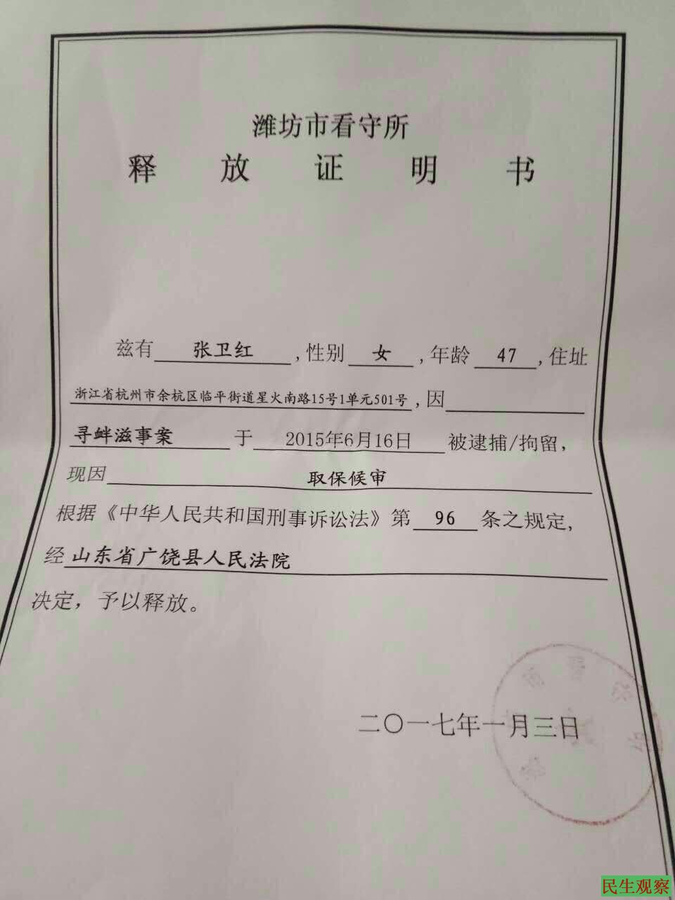 被潍坊警方关押九个多月的张皖荷首获律师会见