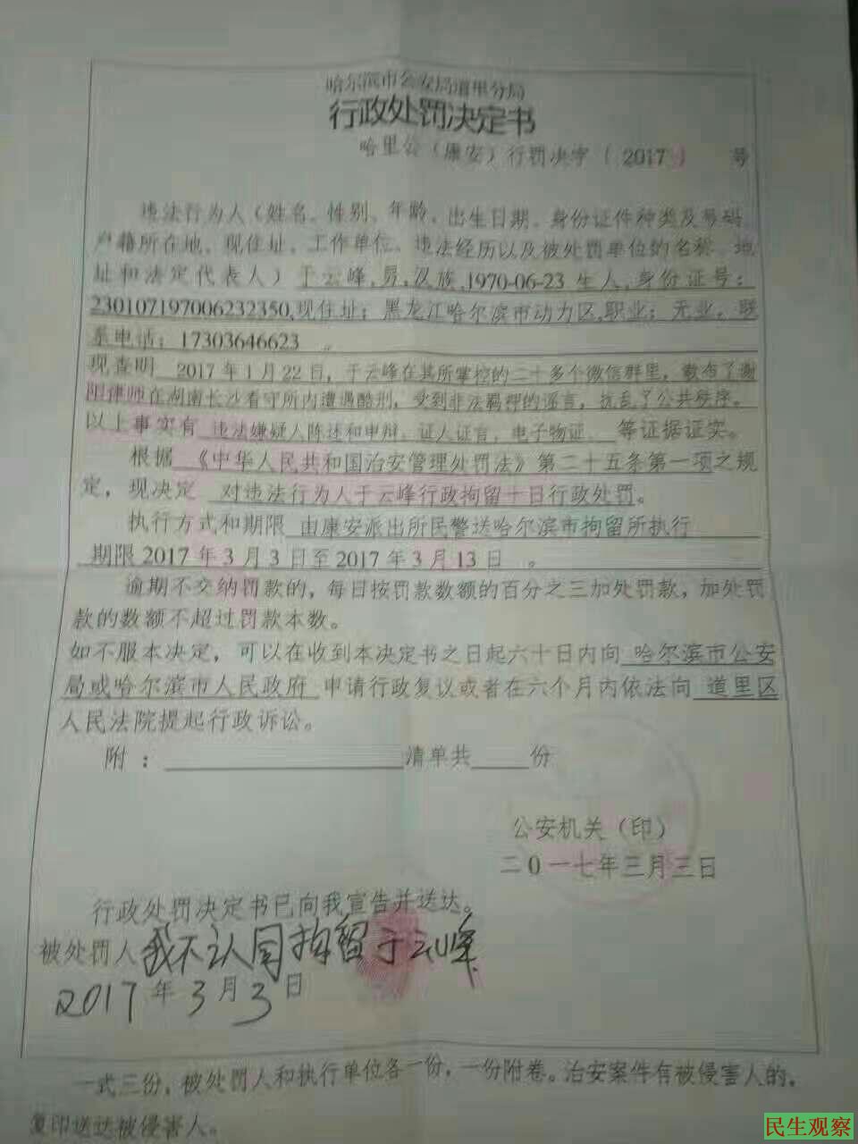 【民生观察工作室2017年3月13日哈尔滨消息】本网获悉,黑龙江哈尔滨维权人士于云峰今天又被行政拘留十天。