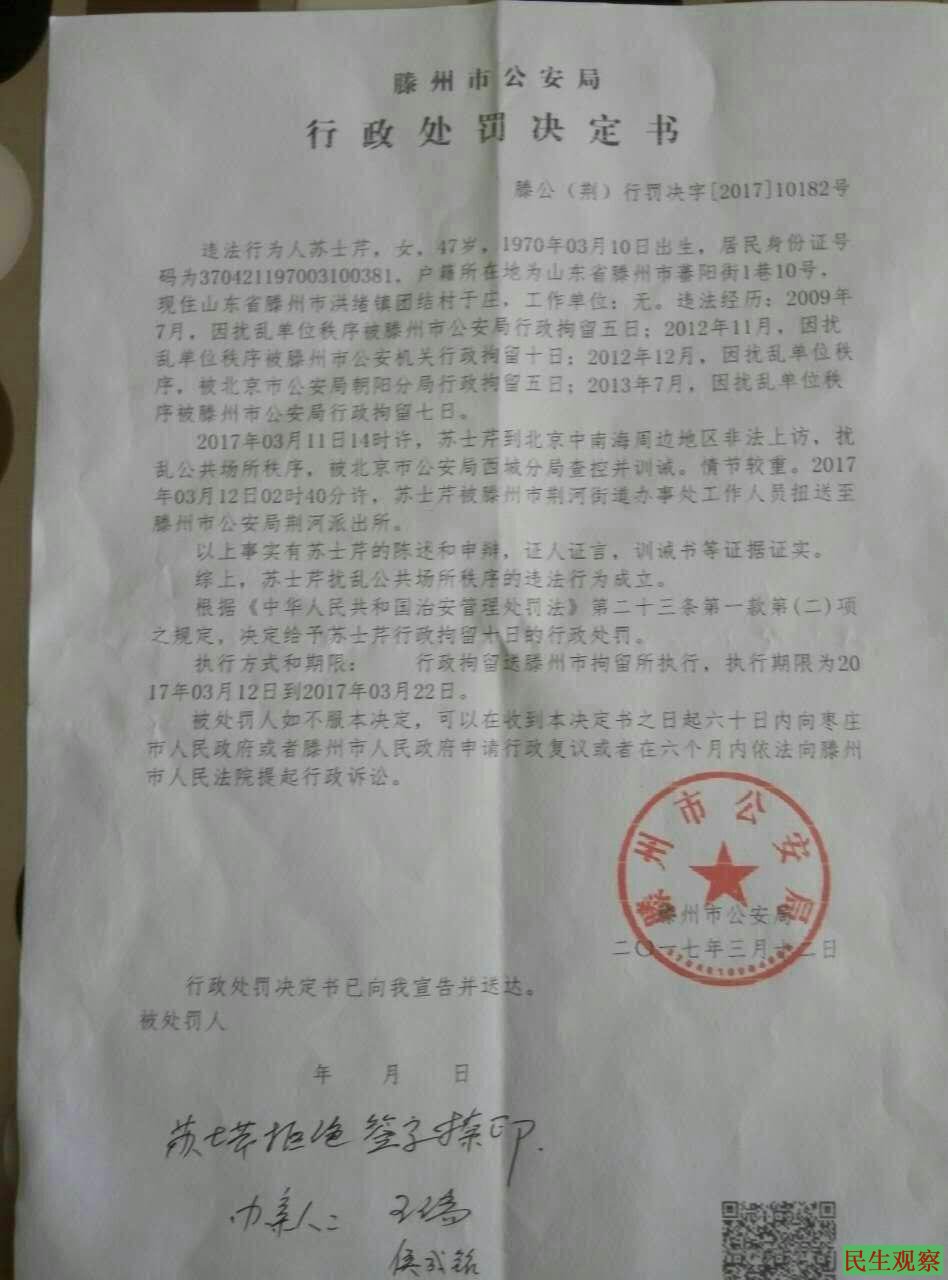 苏士芹于本月11日在北京中南海附近邮局邮寄挂号信时被民警查身份证带到久敬庄,由藤州驻京办人员带回当地后于第二天12日被处以行政拘留十天。