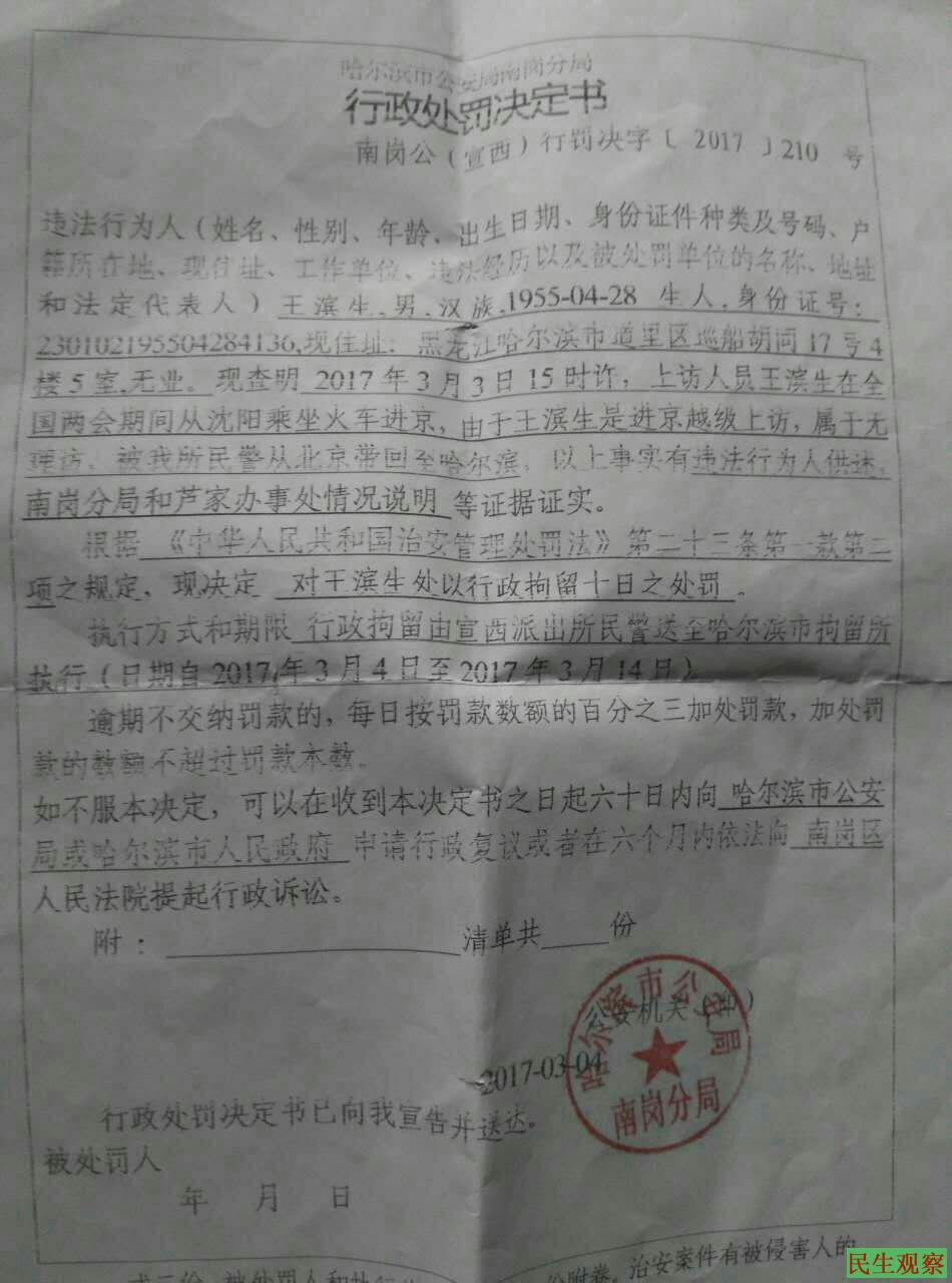 哈尔滨王滨生于云峰被拘留_民生观察 关注底层民众命运