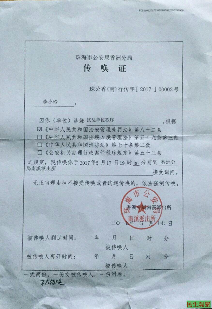 【民生观察工作室2017年5月18日珠海消息】本网获悉,广州李小玲昨日(5月17日)下午两点多前往珠海中院办事,由于工作人员态度蛮横而引发冲突,致使李小玲被困中院四个小时,后被以“扰乱单位秩序罪” 传唤至南溪派出所,期间出现头痛、眼痛、呕吐等急性青光眼症状,在其要求警方急送医院下,警方仍继续对其审讯笔录,至凌晨(5月18日) 四点多才送珠海人民医院,医生检查后告知,由于病情延误太久, 必须做手术才可治愈。