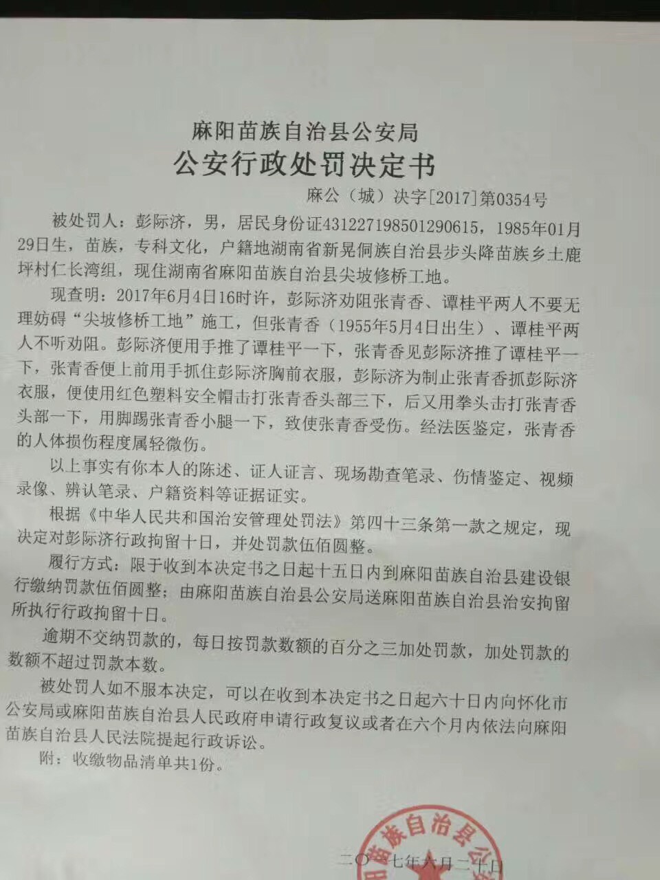 据公开消息显示,6月4日当天,麻阳苗族自治县村民张青香因为阻止开发商于自家土地上非法施工,被开发商雇请的黑势力人员彭际济打伤入院,报警无果,其后家属多次报警和交涉,暴徒彭际济终于于本月21日被麻阳县公安局行政拘留十天,关押于麻阳县拘留所。