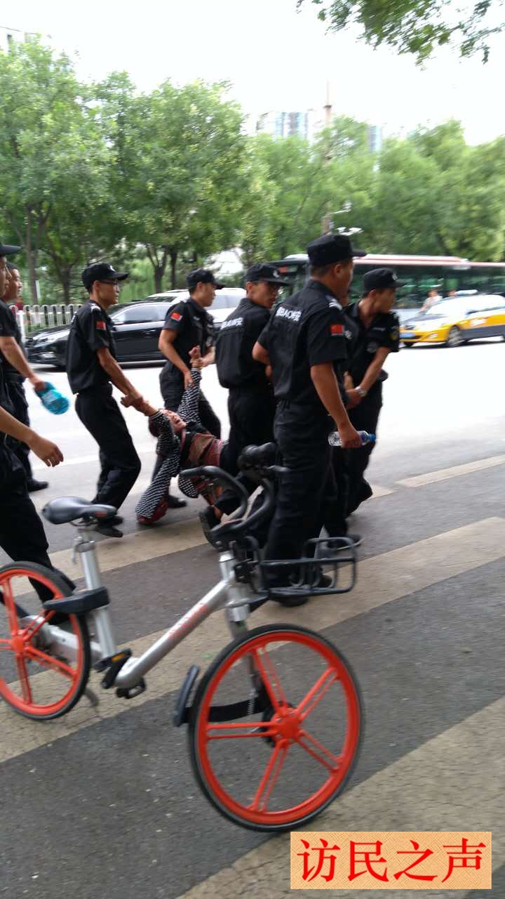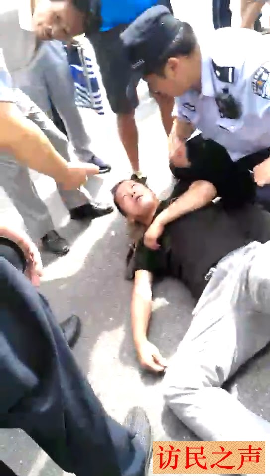 本网随后联系到在场访民得知,今天下午孙东生在信访局门外被几个安徽截访人员打伤后有人报警,警察和保安来了驱赶围观人员。有两个背着大包的访民走的慢被保安拉扯倒地,还有警察和保安对倒地的访民动粗。两个倒地的访民挣扎着用脚登,被说成是袭警,直接拖到警车上拉走了。