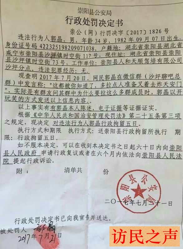 崇阳县公安局出具的处罚决定书中显示,7月20日,网民郭晶在微信群(沙坪聊吧总群)中发言称,这都被你们知道了,多拉点人准备叉着去炸天安门。” 故根据《治安管理处罚法》第二十五条第三款之规定决定行政拘留郭晶5日。