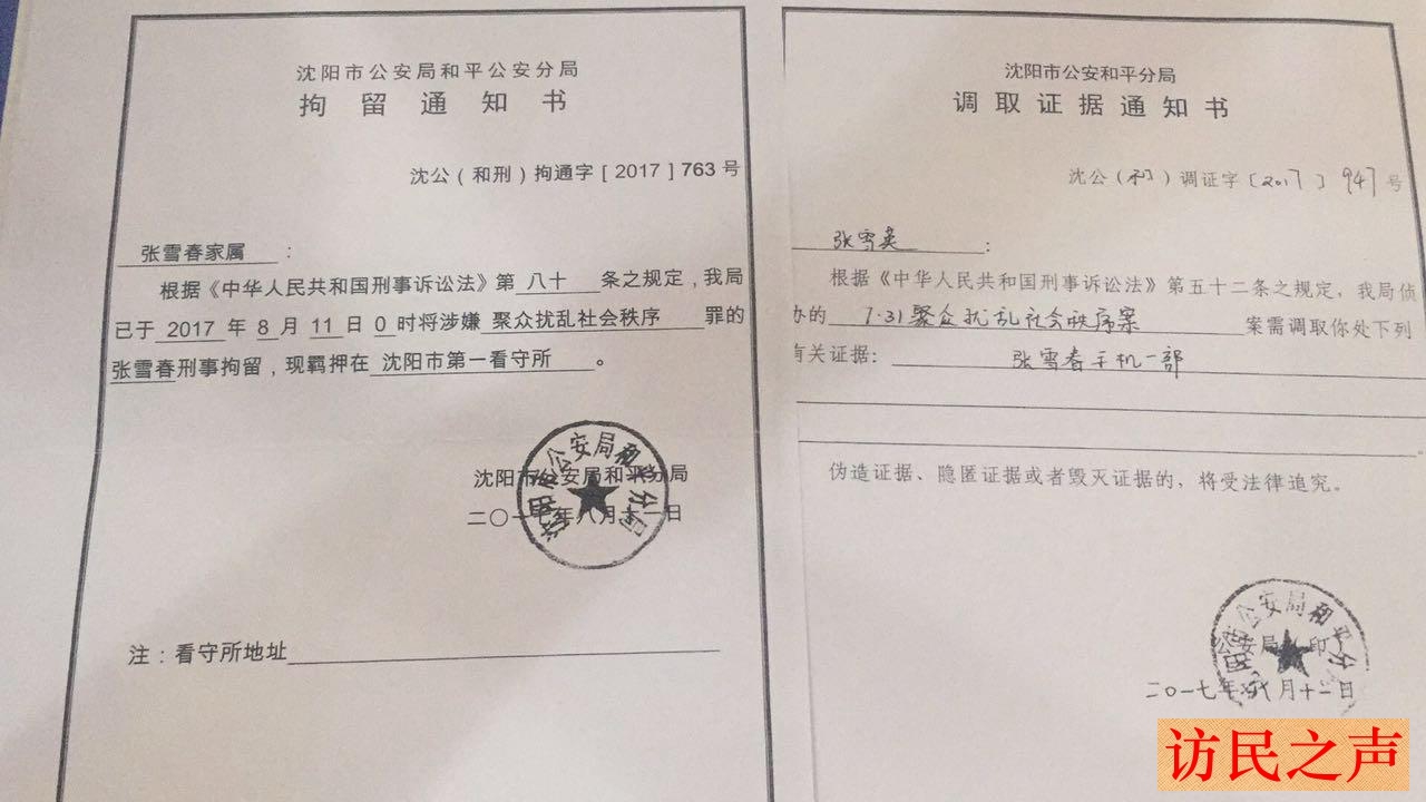 本网了解到,就在张鑫为联系不到母亲焦急万分时,于次日下午接到公安局电话通知,她母亲被拘留了,让她第二天去和平分局拿通知书。她同时拿到了一份调取证据通知书,她母亲的手机被扣押。看了这两份通知书她才知道,她母亲是因7月31日“聚众扰乱社会秩序”被刑拘。