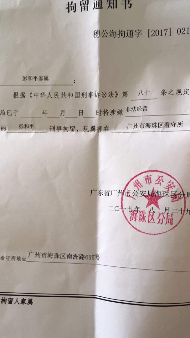 【民生观察2017年9月2日消息】本网获悉,曾于早前介绍印刷厂商给诗人浪子的彭和平证实被广州市海珠区公安分局以涉嫌“非法经营罪”刑事拘留,羁押于海珠区看守所。