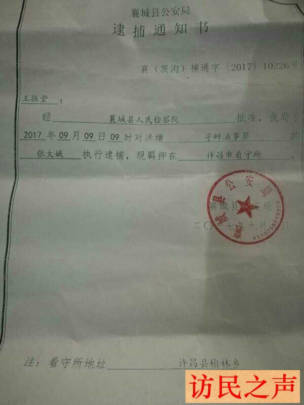 8月2日一群警察闯进我家,不由分说把我儿子王龙飞带走关押在襄城县看守所,并带走了家里两个手机和亲戚家的一台电脑。当时王龙飞的母亲张大娥不在家,8月3日,又把张大娥三个帮忙维权的姐姐带走拘留了五天。8月12日,张大娥在厦门被带回来关押在拘留所,后又被送到许昌看守所。昨天9月9日乡派出所送来逮捕证,张大娥、王龙飞以寻衅滋事罪被逮捕了。