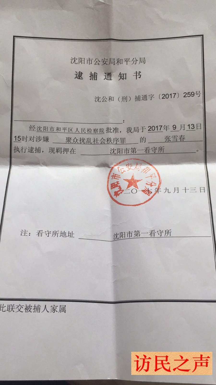 [访民之声2017/9/21消息] 辽宁沈阳市访民张雪春8月11日被沈阳市公安局和平分局以涉嫌“聚众扰乱社会秩序罪”刑事拘留,9月13日,检察院批准将其逮捕,仍羁押于沈阳市第一看守所。