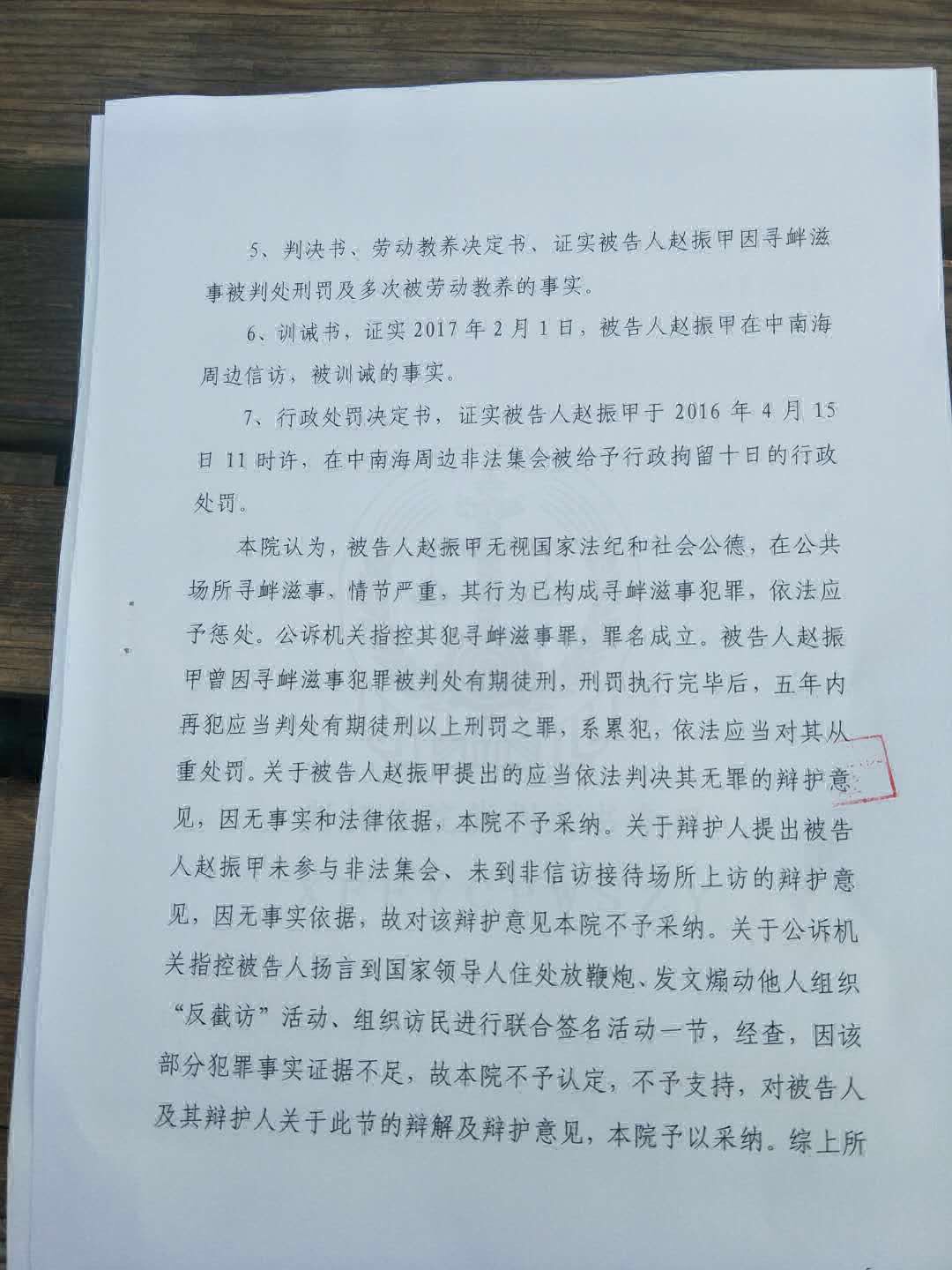 该案在开庭两个月后于今天传出判决结果,赵振甲被判有期徒刑一年。根据判决书显示,新抚区检察院指控赵振甲的犯罪事实总共四起:1,2016年4月18日在北京市西城区西长安街25号附近非法集会、扰乱社会秩序;2,2017年1月26日在北京上访期间扬言到国家领导人住处放鞭炮;3,2017年2月1日在北京中南海周边上访;4,2017年2月7日在敌对网站《新唐人网》发文煽动组织“反截访”签名活动。对四起犯罪事实的指控,尽管辩护律师都作了无罪辩护,但法院最终只采纳了部分辩护观点,仅认定其中的两起犯罪事实不能成立,即对指控2017年1月26日在北京上访期间扬言到国家领导人住处放鞭炮及2017年2月7日在敌对网站《新唐人网》发文煽动组织“反截访”签名活动的犯罪事实,法院认为证据不足而撤销,但仍然用余下两项“犯罪证据”指控赵振甲“寻衅滋事”罪成,判决一年有期徒刑,即时执行。