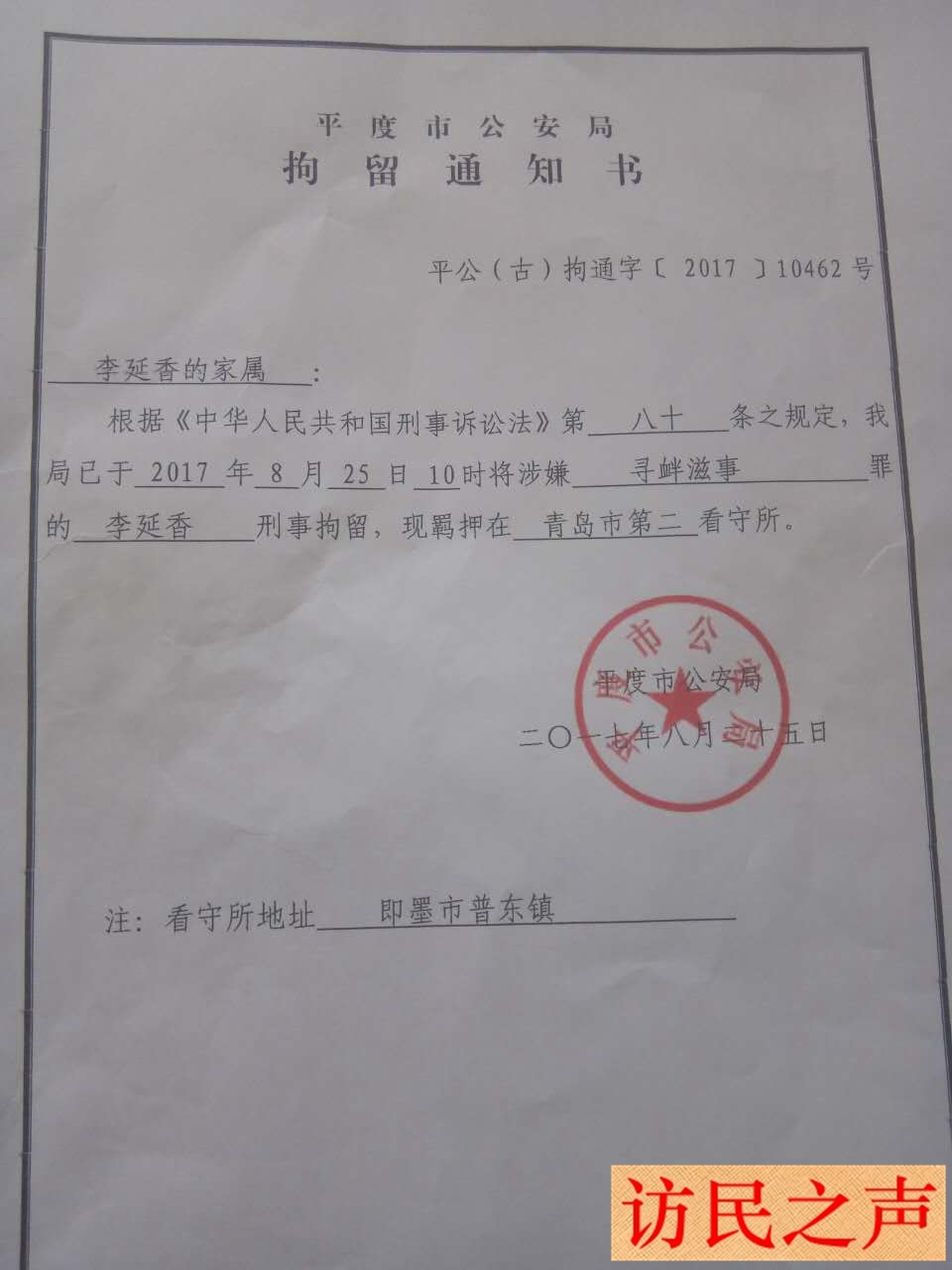 2017年8月17日,李延香被截访人员从北京带回山东,后被山东平度市公安局行政拘留拘留10天。同月25日,被转为刑事拘留,涉嫌罪名为寻衅滋事,现羁押于青岛市第二看守所。对此李延香家属表示,李延香是2017年8月16号,和访民李宗英、孙淑路过天安门时,被北京警察查身份证后送到久敬庄的。当时警号为051269的北京警察解释说,凡是刷出“19”数字的就是重点稳控人员,你们别怪我,怪就怪青岛人渣。8月17日,地方截访人员将她3人截回后各自拘留10天,8月25日被以涉嫌寻衅滋事罪转为刑事拘留。