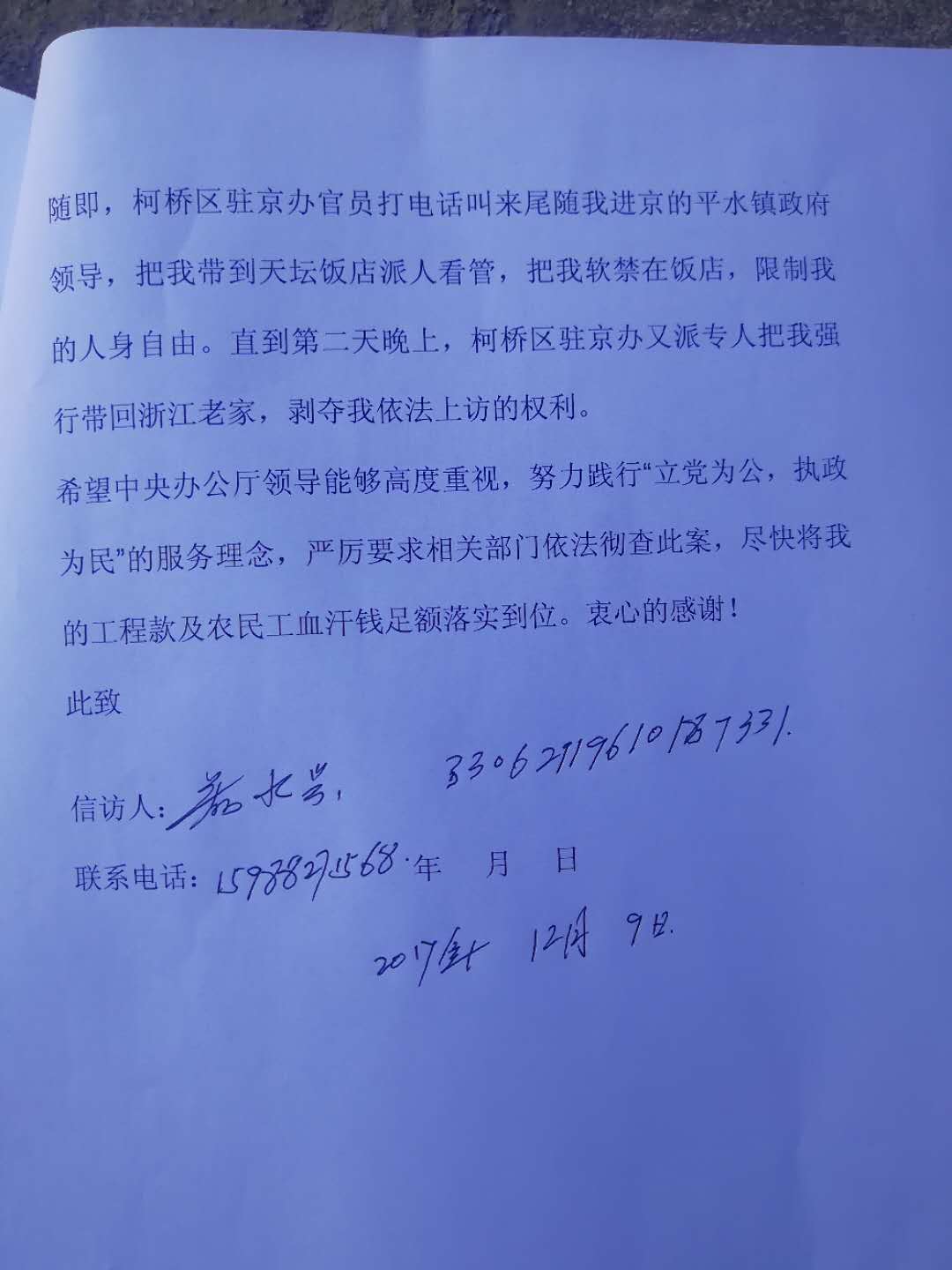 近一年来,他一直不断地向所在地的浙江省有关部门申诉,但平水镇政府领导却无视上级领导的批示,阳奉阴违,不予理睬。万般无奈,他只得进京上访维权。2017年11月22日,他抵达了北京并入住在北京建国饭店准备次日上访。但在当晚11:25时许,绍兴驻京办遭截人员就邀请北京天桥派出所警察,把郑水兴从“建国饭店”带进了派出所。随即,绍兴市驻京办截访人员就来到天桥派出所,把郑水兴接出来,准备把他送到“北京久敬庄接济服务中心”,但郑水兴坚决反抗。于是遭截人员就把他带到了北京“天坛饭店”,并且搜走了他的身份证及信访材料,开始了对他的非法拘禁。之后又被截访人员强行绑架回浙江绍兴的家中看管,目前他已经无法自由出行到北京去上访维权了。